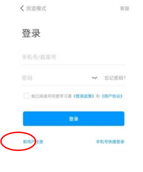 打开安装好的学习通App,进入如下图的登录界面, 点击“新用户注册”进行学习通注册登录。