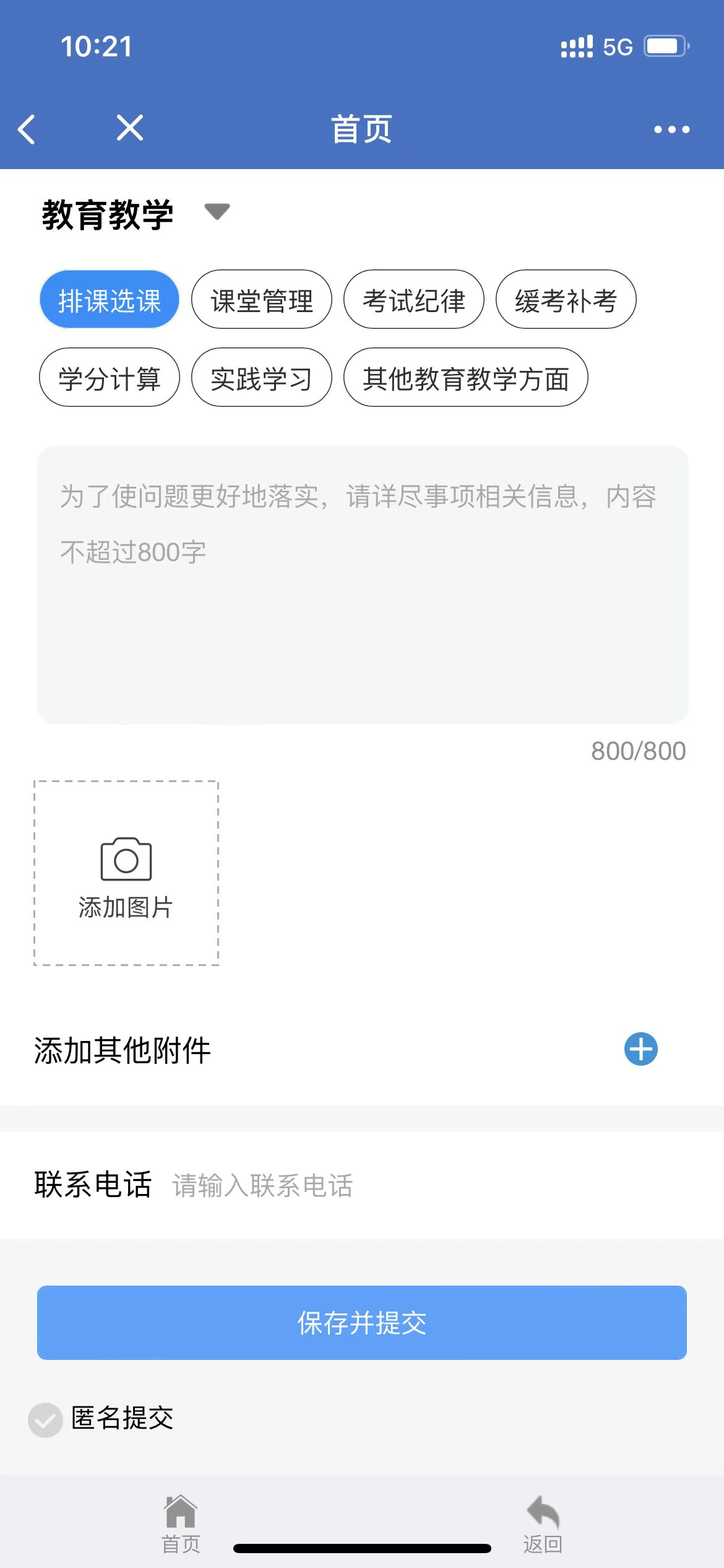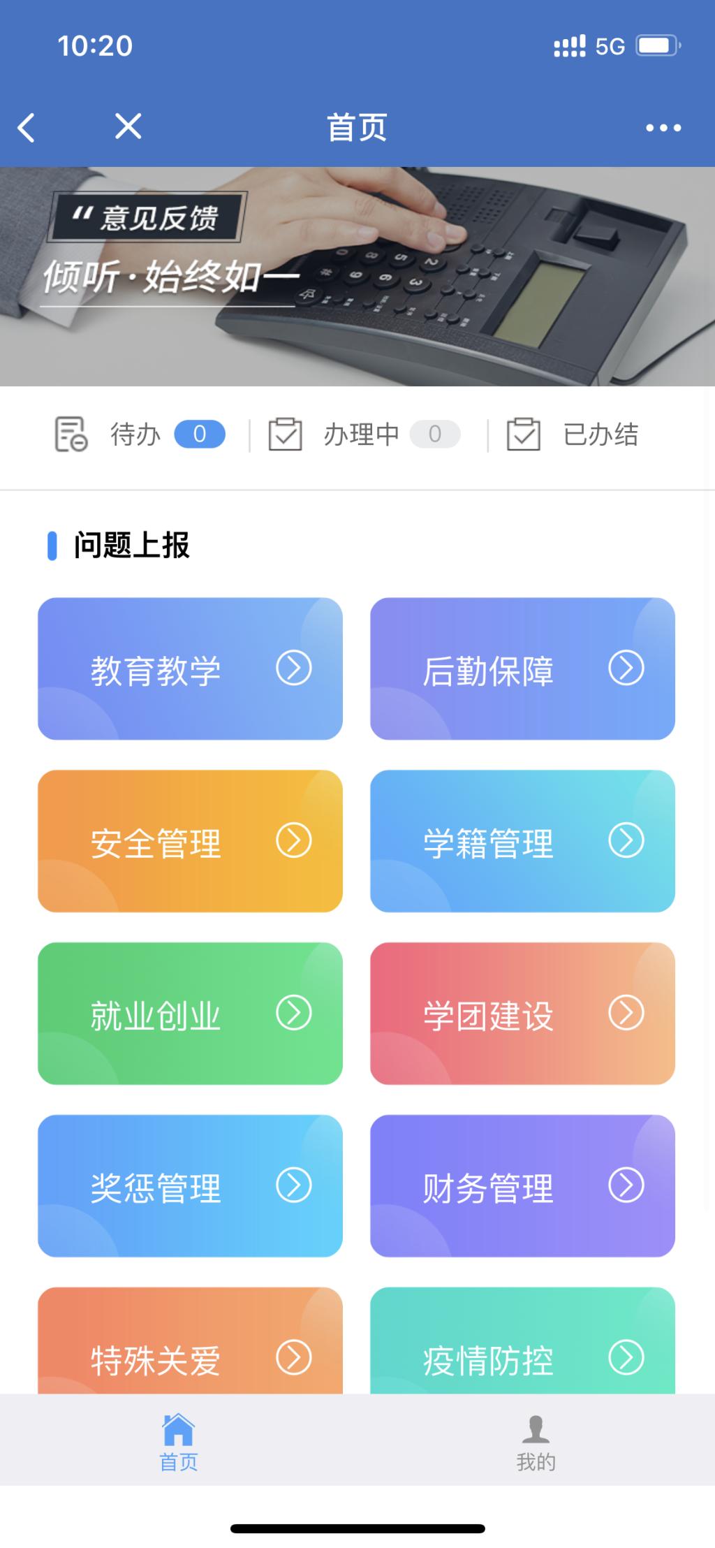 3.内容填写。平台首页展示所有的问题类别,点击需要反馈的一个问题大类,在填报页面选择对应的二级类别。在问题填报页面填写需要反馈问题的文字描述、需要上传的材料(照片、视频、文档等相关材料)、联系电话等相关信息之后进行提交。学校办理完结后,将通过诉求人平台注册手机号进行联系答复。