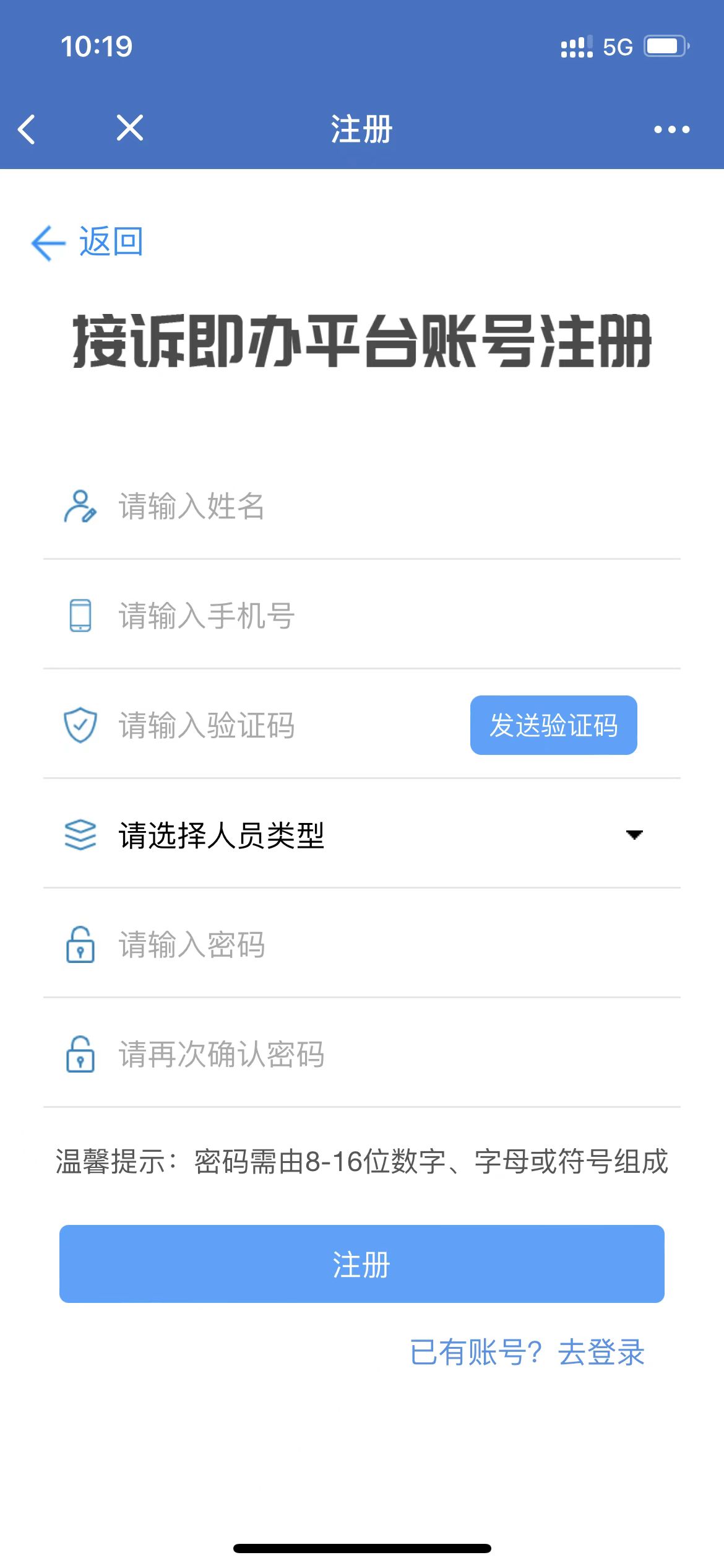 2.账号注册。在平台登录页找到“注册账号”按钮,填写真实姓名、手机号(可接收短信验证码)、人员类型、所属单位以及登录密码等信息(密码需由8-16位数字、字母或符号组成)。信息填写完成后点击底部的“注册”按钮即可完成注册,在登录页面输入注册时填写的手机号和密码即可登录。其中手机号要接收验证码进行校验,注册成功之后将使用手机号作为登录账号;人员类型按照真实身份进行选择(学生或者教职工),所属单位选择自己所在的学校,否则反馈的信息无法进行处理。