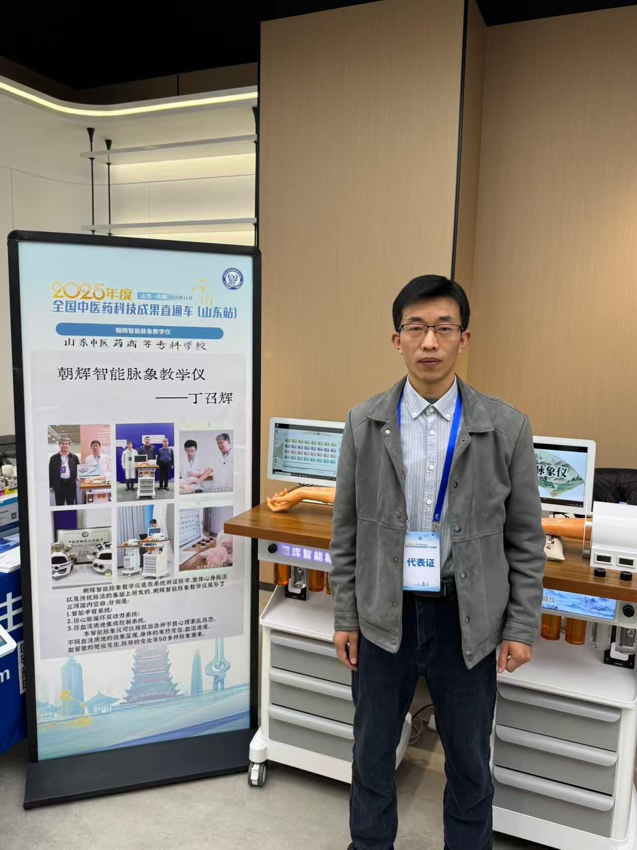 11月8日2025年度全国中医药科技成果直通车(山东站)在济南举行我校中医学专业2025届毕业生丁召辉研发的“朝晖智能脉象教学仪”获得与会专家一致好评。