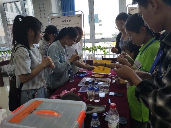 健康香牌是中医系王雷博士带领大学生创新创业团队于去年研制开发的又一新产品,首次在国赛互动体验区亮相便吸引师生们前来体验。健康香牌按照香方,纯手工制作,严格按照配比将各种香材研磨成粉和合而成,采用纯天然中药,无任何化学添加,可作为耳坠、配饰或情侣信物相赠,佩戴后香味飘逸,药性随气味行至体内,怡神养生一举双得。来宾们被这代表传统文化的创意产品深深吸引,在志愿者们的帮助下纷纷动手制作。