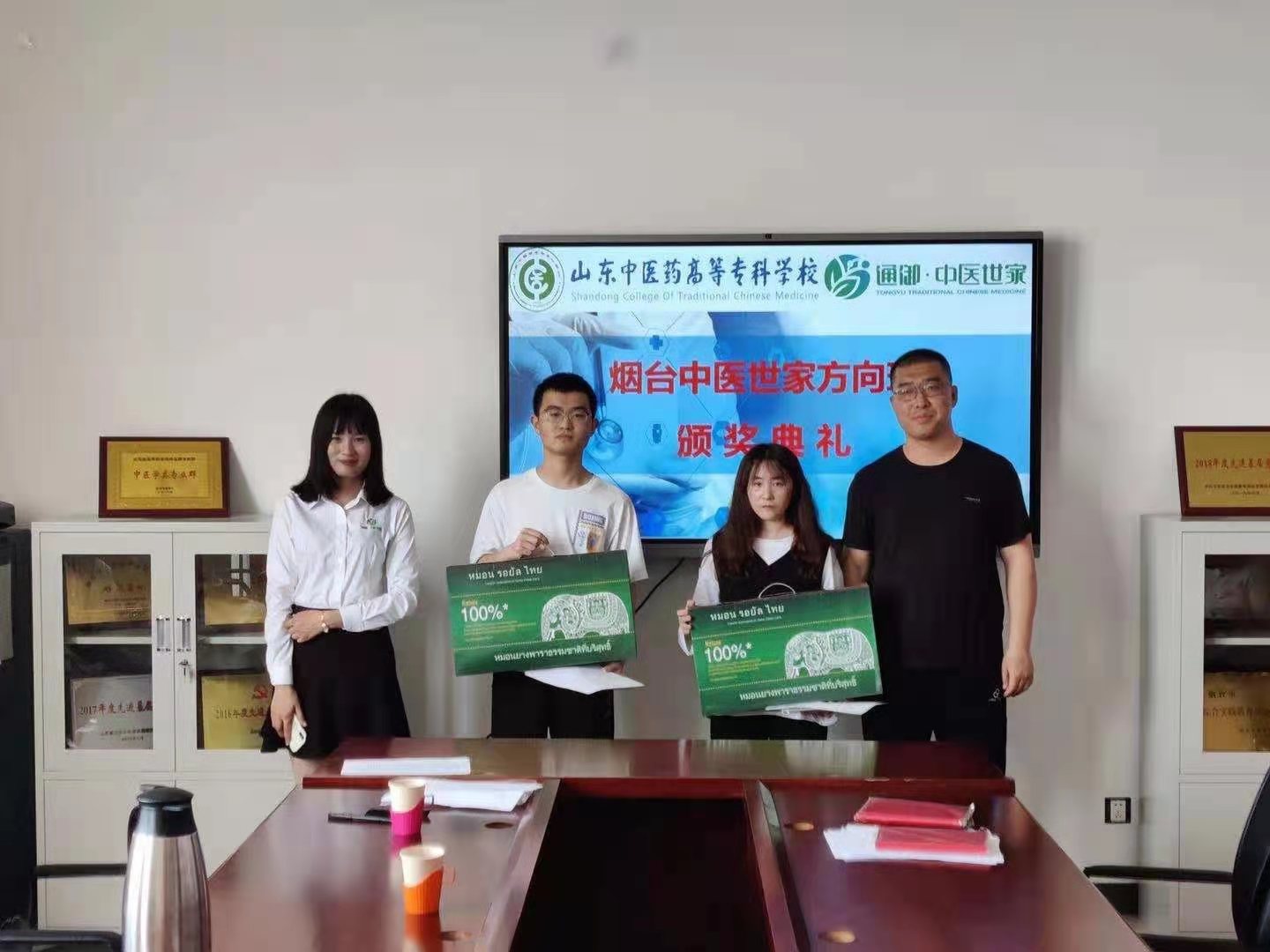 培训课结束,烟台中医世家为寒假期间企业调研获奖同学颁奖。会后,全班21名同学有13名同学积极报名参加6+3实习。