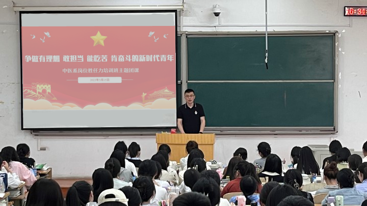 为推进2023年中医师岗位胜任力考核相关工作,进一步提升中医学专业学生岗位胜任力,5月15日晚,中医系党总支副书记于昕为岗位胜任力培训班学生作主题团课。