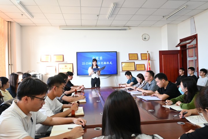 闫方杰强调,学生干部不是头衔,不是职权,是责任,是鞭策,是激励,一定要高标准要求自己,在行为规范上必须严格遵守校纪校规,在日常中要将学生干部的模范作用展现出来。要恪守学生本分,要坚决杜绝少数学生干部身上存在的不良习气。希望新一届学生会继承和发扬上一届学生会的优良传统,进一步增强创新意识,围绕“第二课堂”等重点工作,精心筹划,科学谋划,组织开展健康有益、丰富多彩的课外活动和社会实践,努力推动中医系学生会工作再上新台阶。也希望全体学生会干部在组织活动、参与管理、上下联络等服务同学的具体实践中加强磨炼、增长本领,实现自我价值,用热血谱写“不负时代,不负韶华,不负党和人民”的青春篇章!本次交接仪式的成功举办,为中医系学生会注入了新的生机与活力,相信新一届学生会能够在学风、班风、校风建设中发挥模范带头作用,为广大同学提供更加优质的服务,共同创造学校美好的明天。(中医系 文、图/祖琦)