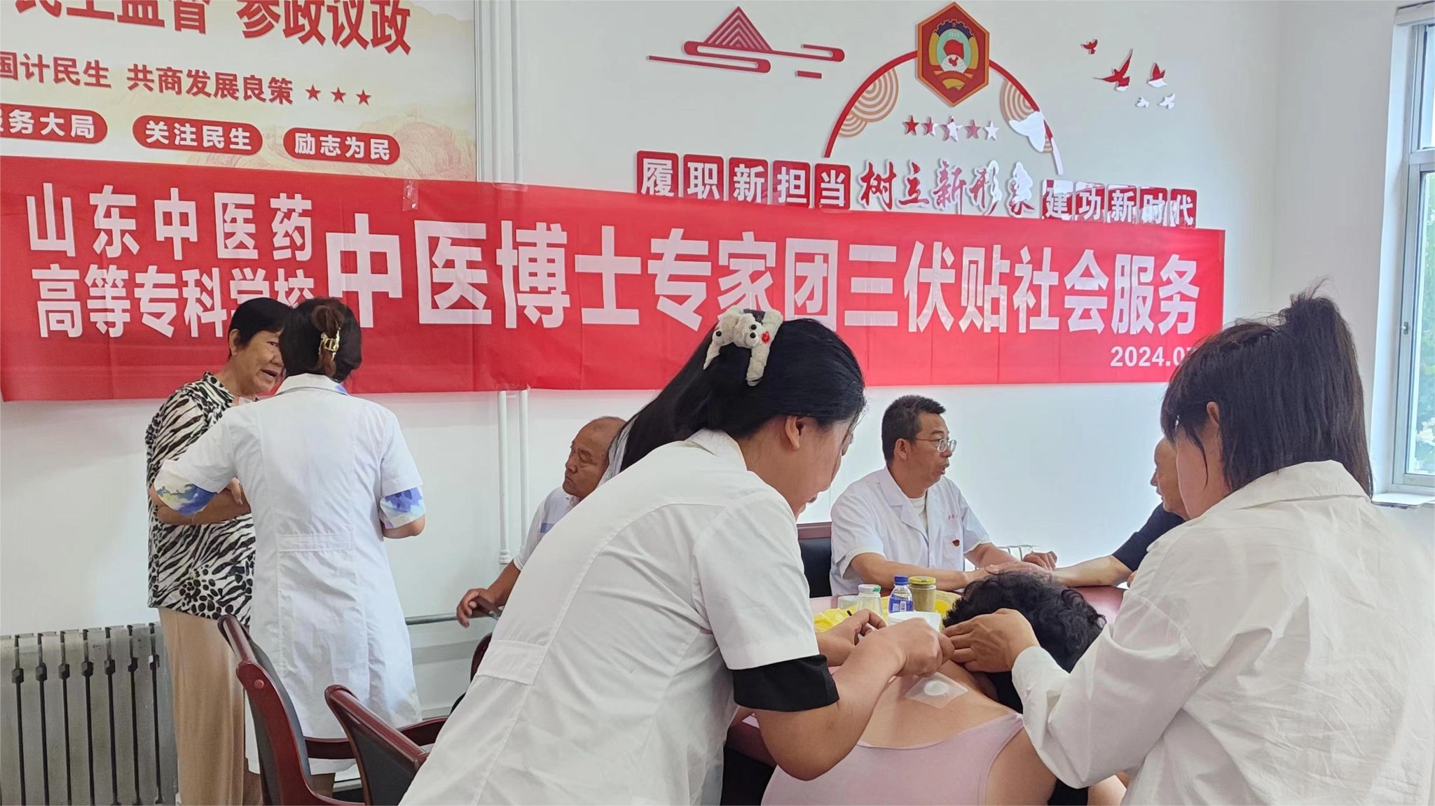 7月15日为初伏第一天,山东中医药高等专科学校中医博士专家团李一平、宋修道、田玲玲及博物馆李亚楠、王思雪等老师,走进牟平区宁海街道办事处政府街社区开展三伏贴义诊活动。