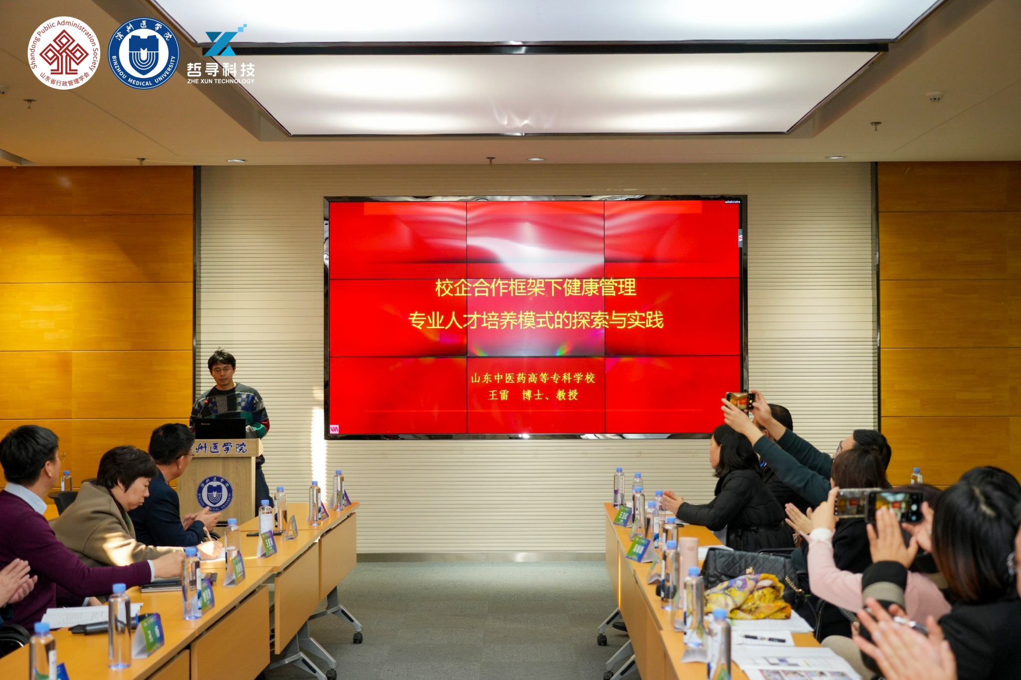 我校健康管理专业负责人王雷博士分享了题为《校企合作框架下健康管理专业人才培养模式的探索与实践》报告。当前健康管理专业发展存在顶层规范缺乏、教学资源不足、职业核心能力欠缺等问题,制约了专业的良性发展。针对这些问题,王雷博士详细介绍了我校在校企合作框架下的人才培养模式和实践做法。通过深度融合教育资源与产业资源,实现人才培养与产业链的有效对接。滨州医学院卫生管理学院党委书记曹同章、山东医智云健康科技有限公司董事长李荣旭对我校的专业建设理念与落地做法给予高度认可,进行了深入交流。