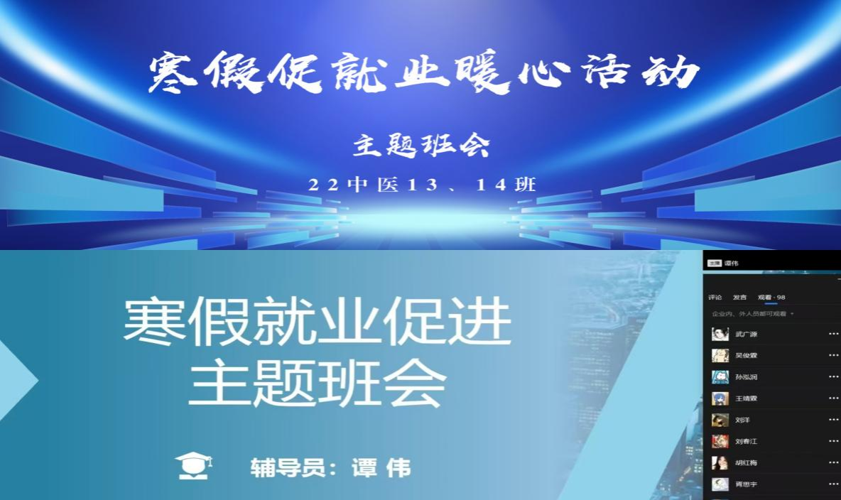为引导毕业生树立正确的职业观和就业观,认清当前就业形势,提升就业意识,让毕业生在思想上、行动上早做准备,抢抓求职关键期,实现高质量充分就业。根据省人社厅和教育厅《关于开展2025届高校毕业生“寒假促就业暖心行动”的通知》要求,中医系于2月15-20日举办了“寒假不断线,暖心促就业”线上主题班会。