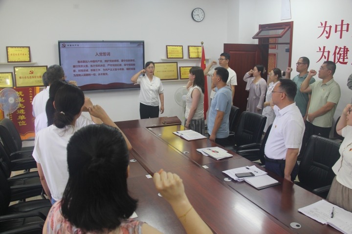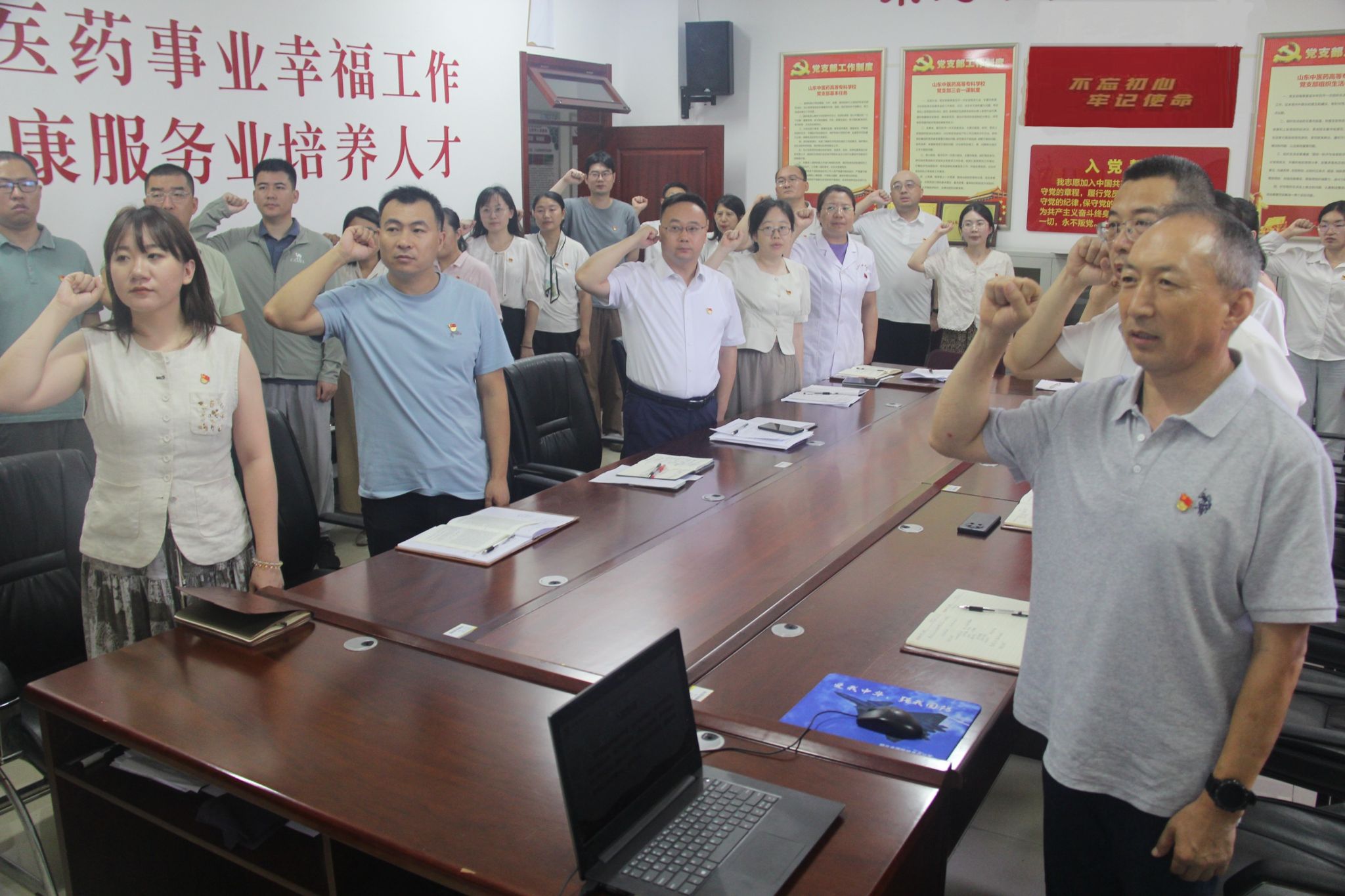 “我志愿加入中国共产党......”在中医系党总支委员、教工党支部书记李春巧的带领下,全体党员高擎右拳,重温入党誓词,铿锵誓言表达了中医系教师不忘初心、牢记使命的决心。