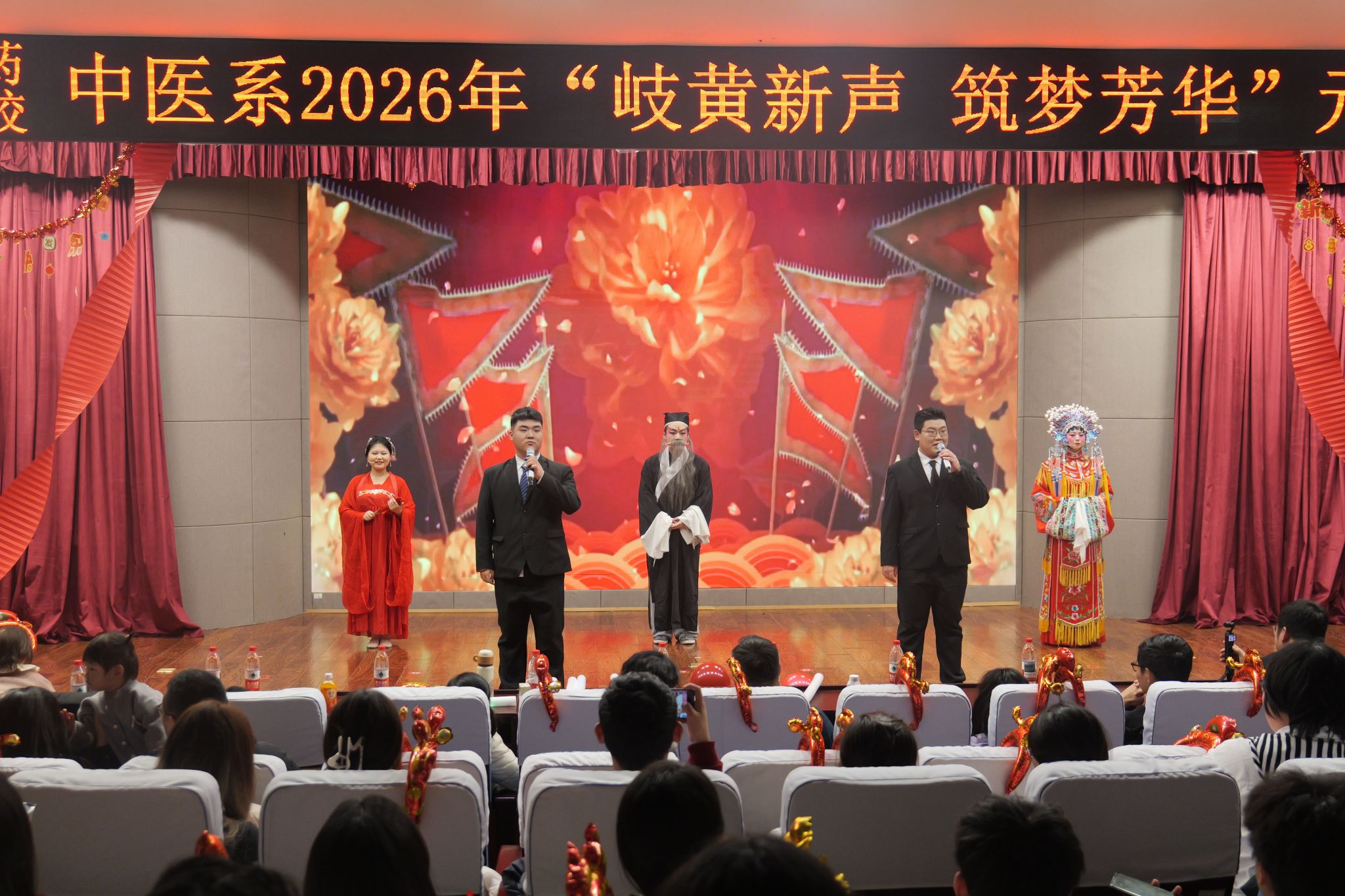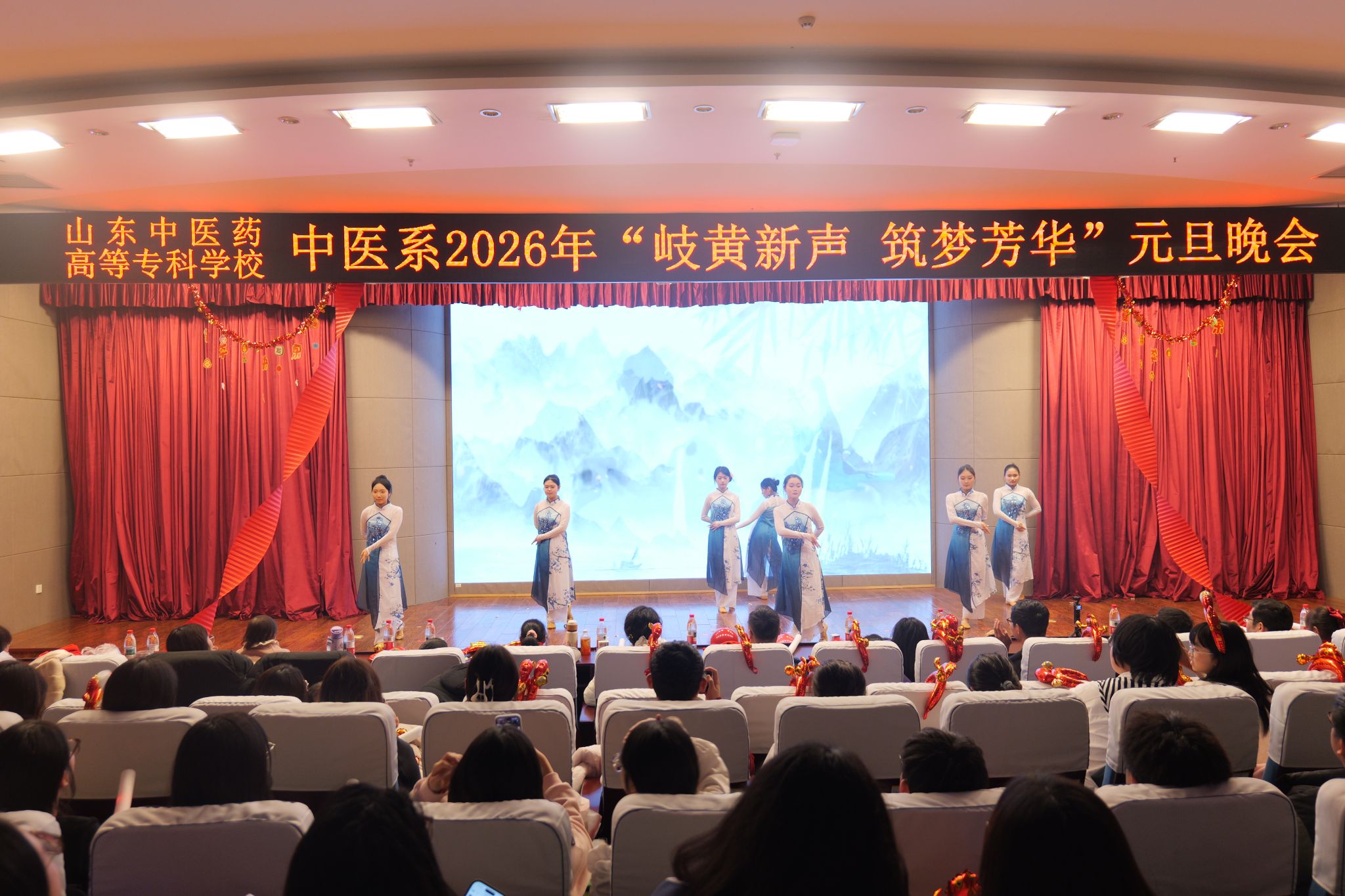 12月28日晚,中医系2026年“岐黄新声,筑梦芳华”元旦晚会在仁和楼学术报告厅举行。中医系党总支副书记闫方杰,团总支副书记曹江山,在校班辅导员与400余名同学齐聚一堂,共同观赏了这场充满青春活力与文化韵味的文艺盛宴。
