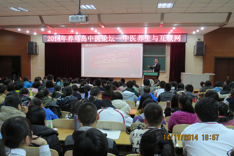 11月14日晚,2014年养马岛中医论坛——中医养生与互联网在教学楼102学术报告厅举行。来自青岛银色世纪健康产业集团培训部的曾广雷经理为大家做了“中医药养生产品与电子商务”的精彩报告。2013级中医学专业银色世纪电子商务班、银色世纪中医养生班、希莱雅女性养生班、艾元堂灸法传承班等多个校企合作专业方向班的同学聆听了讲座,中医系副主任李春巧主持会议。