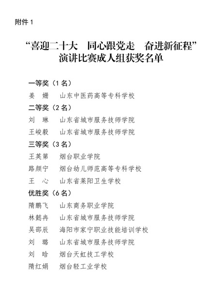 10月19日,烟台市中华职业教育社公布了“喜迎二十大同心跟党走奋进新征程”演讲比赛结果。我系教师姜姗以决赛第一名的成绩荣获成人组一等奖。