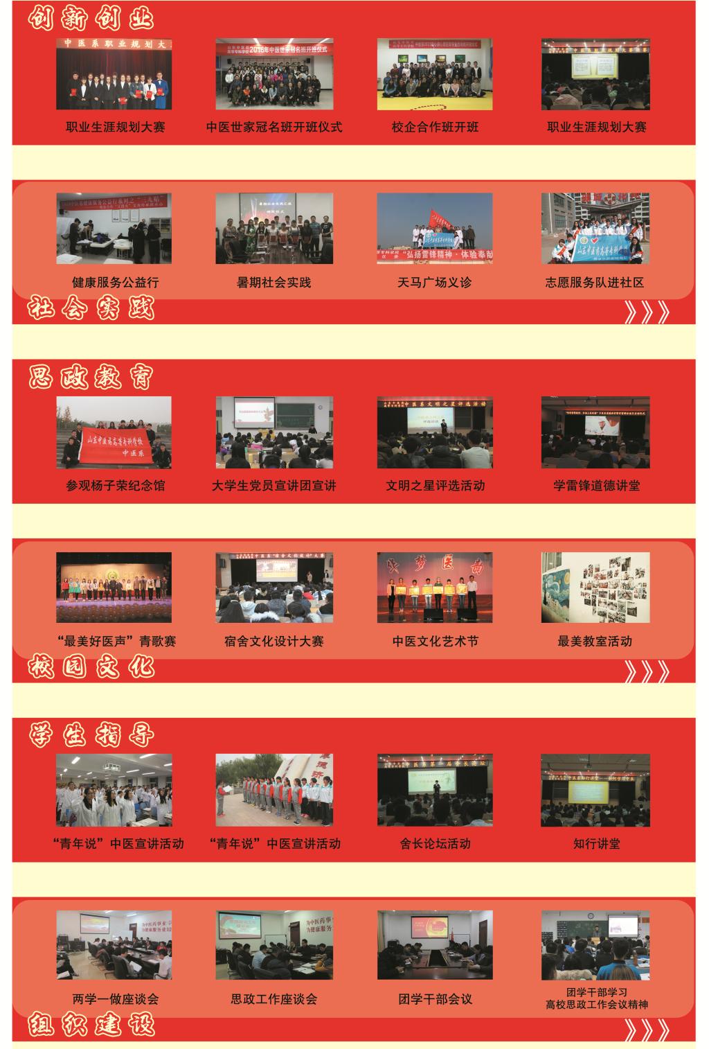 中医系团总支紧密围绕国家改革发展稳定的大局和学校人才培养的中心工作,本着“团结青年、服务青年、发展青年、成就青年”的工作理念,在思想政治教育、校园文化活动、创新创业教育、社会实践活动、团的自身建设和学生组织指导等六大方面服务于学生成长成才。初步形成了以“2+2”学风建设模式为特色的思想政治教育工作平台,以红色先锋和“活力团支部”为重点的组织建设平台,以“知行合一”社会实践和志愿服务为主体的课外实践教育平台,和以“中医文化艺术节”为主体的课外活动平台,为构建学生第二课堂培养和教育体系提供了有力的保障和坚实的基础。获省卫健委2020-2021年度五四红旗团总支荣誉称号。